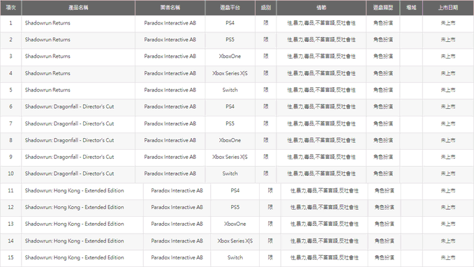 همانطور که توسط Gematsu در توییتر مشاهده شد، هیئت رتبه‌بندی تایوانی به بازی‌های زیر در فرنچایز Shadowrun - Shadowrun Returns، Shadowrun: Dragonfall - Director's Cut و Shadowrun: Hong Kong - Extended Edition - امتیاز داده است. بازی‌های زیر برای پلتفرم‌های زیر رتبه‌بندی شده‌اند - Xbox One، Xbox Series X/S، PS4، PS5 و Nintendo Switch.